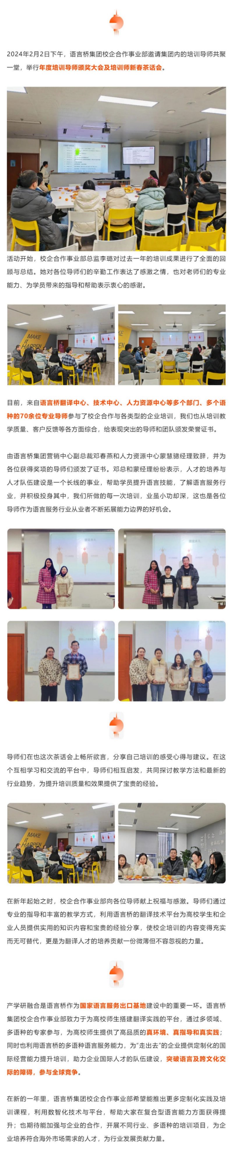 語言橋集團舉行年度培訓導師頒獎大會與培訓導師新春茶話會