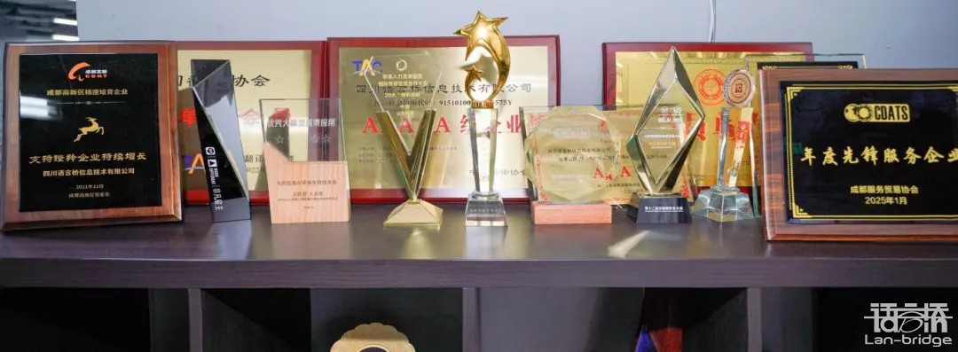 歷經(jīng)25年,語言橋獲得過多種獎(jiǎng)項(xiàng)和榮譽(yù),如中國十佳翻譯服務(wù)企業(yè)、中國翻譯服務(wù)行業(yè)5A級(jí)筆譯+口譯認(rèn)證企業(yè)、國家語言服務(wù)出口基地、國家高新技術(shù)企業(yè)、四川省技術(shù)中心等。同時(shí),語言橋也獲得了多項(xiàng)國際標(biāo)準(zhǔn)化組織的認(rèn)證,如 ISO 9001質(zhì)量管理體系認(rèn)證、ISO 27001信息安全管理體系認(rèn)證、ISO 45001職業(yè)健康安全管理體系認(rèn)證等。