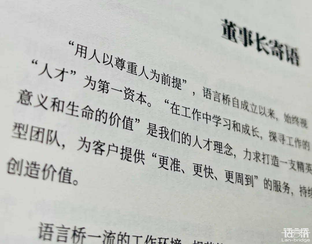 最后還想提一下,語言橋之所以能在翻譯圈里嶄露頭角,除了以上的“自我吹噓”之外,還有一個(gè)原因,就是公司的經(jīng)營理念和價(jià)值觀。先進(jìn)的經(jīng)營理念和積極向上的價(jià)值觀像燈塔一樣指引著大家前進(jìn),我想這是一家企業(yè)想要成為行業(yè)頭部的必要條件。自公司成立之初,就樹立了“把翻譯當(dāng)項(xiàng)目來管理,把公司當(dāng)企業(yè)來經(jīng)營”的理念,并建立了相對(duì)規(guī)范的管理和經(jīng)營體系。我記得2003年在沙灣辦公室的墻壁上掛出了“四個(gè)一流”的標(biāo)牌,即“營造一流的工作環(huán)境,吸引一流的翻譯人才,提供一流的翻譯服務(wù),成就一流的翻譯企業(yè)”。